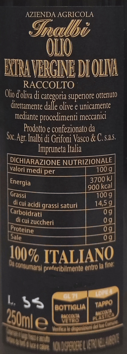 Il nostro olio è stato selezionato, dalla Camera di commercio, come tra i migliori della provincia di Firenze: acidità 0,15%, n. perossidi 5,7 (meq 02/kg), tocoferoli e biofenoli 550 mg/Kg.
